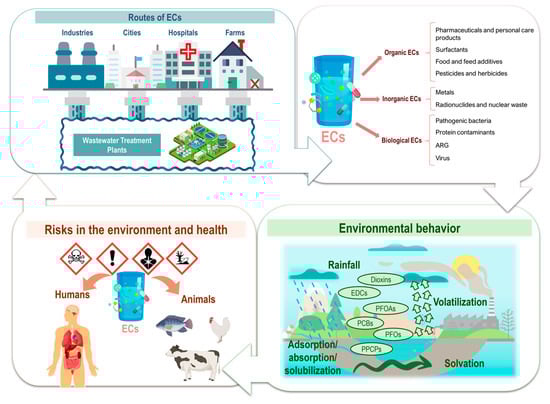 The importance of studying ECs lies in their intensive use in various fields, such as pharmaceuticals, personal care products, agricultural pesticides, and industrial additives [2,5]. Furthermore, urban and industrial wastewater treatment plants are not efficient enough to eliminate these compounds, resulting in their reintroduction into the environment, where they persist and may accumulate [6]. A study by Fatta-Kassinos et al. [7] highlights that these compounds can persist in the environment and are being reintroduced into the human food chain through drinking water. The release routes of EC to the environment and eventual effects are disclosed in Figure 1. In traditional wastewater treatment plants, pharmaceuticals, disinfectants, and biological contaminants such as antibiotic-resistant bacteria and viruses are not effectively removed. As a result, these pollutants remain untreated, allowing them to enter the environment, where they can accumulate, spread, and pose significant risks to human health and ecosystems [8].