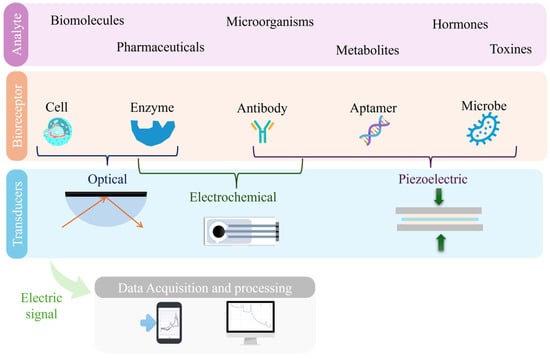 As discussed in Section 1.1, biosensors are sophisticated analytical devices that integrate a biological recognition element with a physicochemical transducer to detect specific analytes (Figure 2).