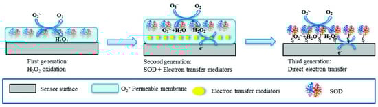 Principle of detection and the generational evolution of superoxide biosensors utilizing the superoxide dismutase enzyme. The figure illustrates the progression from first-generation biosensors, relying on direct enzyme–substrate interactions, to second- and third-generation biosensors, which incorporate advanced materials and electron transfer strategies to enhance sensitivity, specificity, and stability. Reprinted with permission from Liu et al. [42]. Copyright 2015 American Chemical Society.