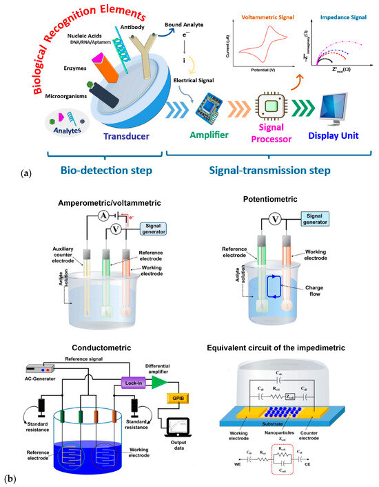 (a) Stages in the functional mechanism of an electrochemical biosensor. This diagram is reprinted from [53], copyright 2023, with permission from Elsevier. (b) Schematic diagrams of various electrochemical transducers. This diagram was adapted from Naresh and Lee [47]. Copyright 2021 MDPI (Basel, Switzerland).