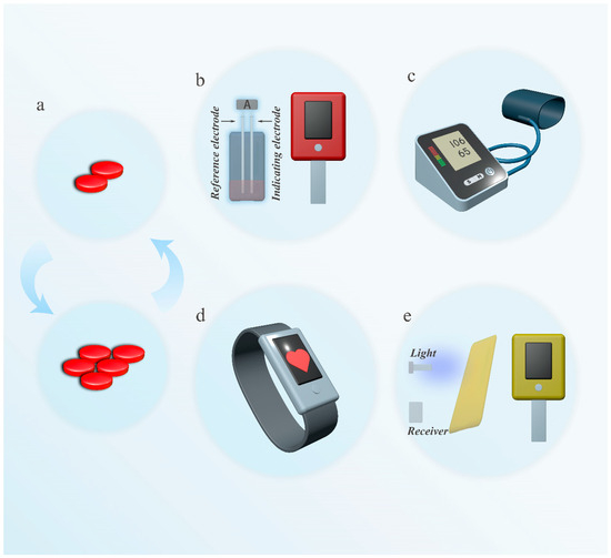 Examples of common dynamic monitoring to adjust medication for cardiovascular disease. (a). Schematic diagram of optimizing dosage. (b). Measurement of INR using a coagulation analyzer (left image: illustrating possible electrochemical principles) (c). A blood pressure monitor used to measure blood pressure. (d). An electronic watch that monitors heart rate. (e). Cholesterol meter for measuring cholesterol.