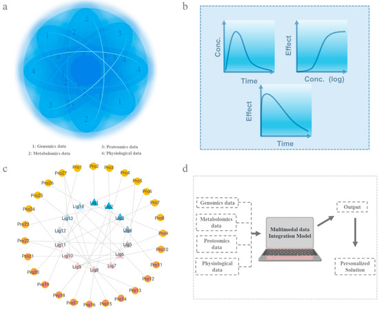 In this context, pharmacokinetic and pharmacodynamic models (PK/PD models) serve as essential tools for data integration and have been widely used in drug dosage design and efficacy evaluation [290]. Meanwhile, drug–target networks provide a novel perspective for systematically analyzing the interactions between drugs and their targets. These network models not only optimize drug design and combination therapy strategies but also offer critical theoretical support for precision treatment [291]. Moreover, with the rapid advancement of artificial intelligence, machine learning has gradually become a pivotal tool in precision medicine. By leveraging multidimensional data, machine learning can uncover hidden correlations between datasets and dynamically predict drug responses and adverse effects, thereby providing scientific support for the development of personalized treatment plans (Figure 4a) [292]. The following sections will explore how PK/PD models, drug–target networks, and machine learning utilize multidimensional data integration to achieve more efficient precision medicine.