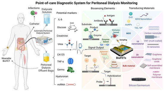 The primary objective of this review is to critically evaluate the adaptability of BioFETs for PD monitoring, focusing on three key areas: (1) the design and optimization of BioFETs components (probes, transducing materials) for PD-specific biomarker detection; (2) the technical and clinical barriers to integrating BioFETs into PD workflows; and (3) emerging strategies (e.g., multiplexing, PoC) to address these challenges. By synthesizing advances in BioFETs engineering with unmet clinical demands in PD, this work delineates a roadmap for translating laboratory innovations into practical, patient-centric diagnostic tools. The successful integration of BioFETs into PD management could revolutionize personalized medicine, offering tailored interventions for individual patients and greatly improving the quality of life and long-term outcomes for those with ESRD undergoing PD. To provide a conceptual overview, Figure 1 illustrates the interplay between the core components of BioFETs and their applications in PD monitoring.