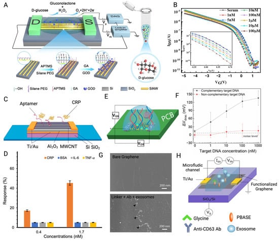 (A) Glucose oxidase and PEG layers were co-modified on the SiNW surface for the glucose detection through catalytic principle. (B) Transfer curves of SiNW-BioFETs for detecting glucose in serum samples [77]. (C) Schematic of the MWCNT-FET modified with aptamer for capturing target CRP. (D) The response demonstrated by BioFETs indicated its high affinity for the target CRP despite interference from three other proteins commonly present during PD inflammation [78]. (E) Schematic of a PNA-based EGFET fabricated on PCB for DNA hybridization. Blue lines are the PNA probes, while the red ones are the target DNA. (F) Mean values of Vdirac shifts of BioFETs used for DNA hybridization (bars represent standard deviations of 5 BioFETs) [79]. (G) SEM images of bare graphene and graphene layer conjugated with probes and exosomes. (H) Schematic of a microfluidic GFET modified with CD63 antibody for detecting the surface protein of exosome [80] (images used under Creative Commons Licenses).