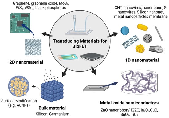 Transducing materials can be broadly categorized based on their dimensional structure (Figure 7); 3D bulk materials, such as silicon (Si) and germanium (Ge), are commonly used [134], as well as nanomaterials, such as metal oxide semiconductors (MOS), including zinc oxide (ZnO) and indium gallium zinc oxide (IGZO) (Figure 8) [135]. One-dimensional (1D) nanostructures, such as silicon wires (SiNWs) [50] and carbon nanotubes (CNTs) [86], along with two-dimensional (2D) nanomaterials, such as graphene [79], black phosphorus [136], or transition metal dichalcogenides (TMDCs), such as MoS2 [137], are also frequently employed (Figure 9). Additionally, metal nanoparticles are often used to modify the surfaces of these materials to amplify detection signals [138].