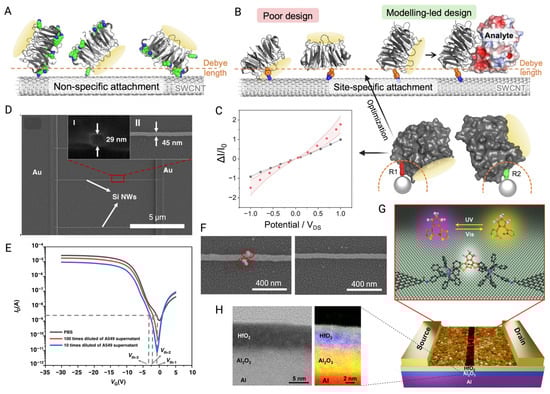 (A) The immobilization of the non-specific receptor protein (BLIP2) on the SWCNT channel of FET leads to binding events exceeding the Debye screening length. Green parts represent lysine residues. (B) Poor design part indicates that the binding site of BLIP2 is obstructed by the CNT or that the binding reaction occurs outside the Debye length. The proposed modeling-led design optimizes analyte binding within the Debye length and introduces an electrostatic profile to the SWCNT. (C) I-VDS before (black) and after (red) the attachment of two viable rotamers for SWCNT docking. The shaded region is the standard error of the average values [141]. (D) SEM image of SiNW channel. Inset I and II are the SEM images of cross section and top view, respectively. (E) Ids-Vgs curves of BioFET measured with various cell concentrations and PBS. (F) SEM image of exosomes captured by the CD63 antibody-modified FET channel and control channel [50]. (G) Schematic of single-molecule FET structure with a single dinuclear ruthenium-diarylethene (Ru-DAE) complex connects the nanogapped graphene point contacts for optimized functions. (H) Left: STEM analysis of the cross section of the Al/Al2O3/HfO2 multilayer structure under 200 kV. Right: XPS analysis of the dielectric layer with 5 nm Al2O3 and 5 nm HfO2 [142] (images used under Creative Commons licenses).