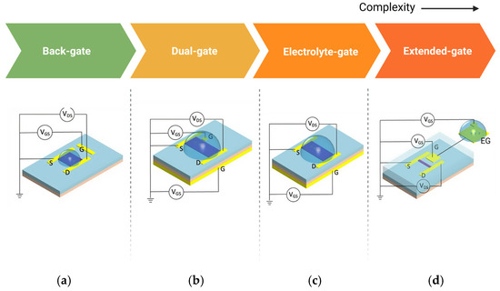 The configuration of BioFETs plays a crucial role in influencing the sensor’s performance, even though the underlying principle remains the same across different types [182]. For example, in graphene-based FETs (GFETs), detection of bioreceptor–analyte interactions depends heavily on the electrostatic gating effects of graphene [163]. Based on how gate voltage is applied, BioFETs can be categorized into several configurations, including back-gated, dual-gate, electrolyte-gated (EGFETs), and extended-gate designs (Figure 10).