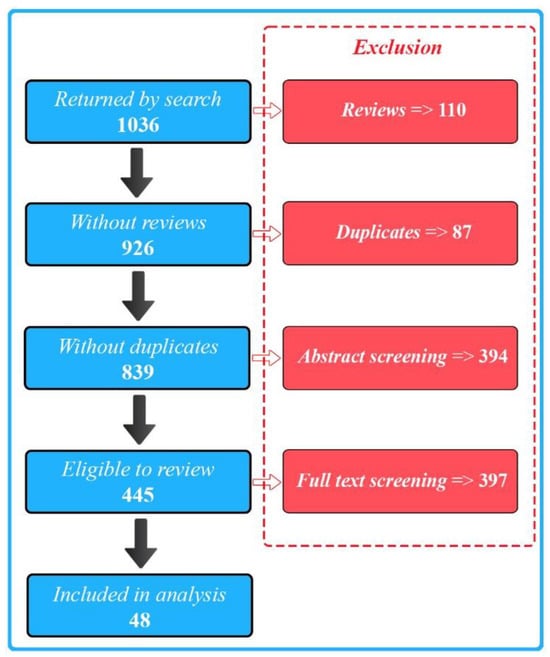 We selected a total of 48 publications for our final full review. We identified these from 1036 initial search results (Figure 1) and excluded the majority of the papers due to a lack of either biosensing, wearable, or AI aspects of the described research.