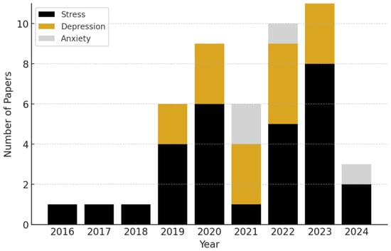 We present the categorization of research papers by the specific mental health conditions they address, per year, in Figure 2. The data reveal a clear upward trend in the volume of research integrating wearables and AI over time, particularly starting in 2019.
