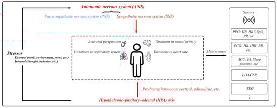 Stress involves the activation of the autonomic nervous system (ANS) and the hypothalamic–pituitary–adrenal (HPA) axis. The ANS, comprising the sympathetic nervous system (SNS) and parasympathetic nervous system (PNS), manages body functions to maintain balance. During stress, the SNS heightens responses like heart and respiration rates as well as sweat production. Simultaneously, the HPA axis triggers cortisol secretion, which supports the body’s fight-or-flight response by modifying physiological processes and reinforcing SNS effects [,,,]. Monitoring the activities of the SNS and HPA axis can offer insights into a person’s overall health status, including their mental well-being (Figure 3).