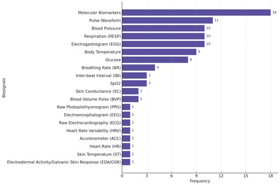 Distribution of biosignals used in stress-focused studies. Many studies used multiple biosignals.