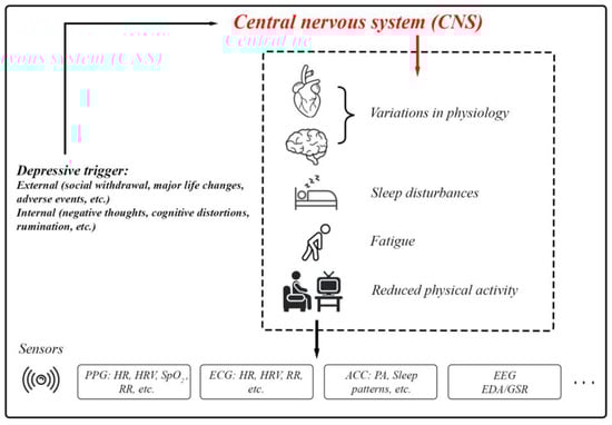Depression typically arises from a complex interplay of social, biological, and psychological factors []. Depression is a core symptom of at least two pervasive mental health disorders: Major Depressive Disorder (a form of clinical depression that includes major depressive episodes) and Bipolar Disorder (includes a presentation of hypomanic/manic symptoms and often depressive episodes) [,]. Depressive episodes must last for at least two weeks for a clinical diagnosis and are characterized by persistent feelings of guilt, worthlessness, helplessness, changes in appetite and sleep patterns, suicidal thoughts, and a loss of interest in previously enjoyed activities []. Depression involves disruptions in the Central Nervous System (CNS). External and internal depressive triggers activate pathways that result in physiological, cognitive, and behavioral changes (Figure 6). These include variations in HR, neural activity, sleep disturbances, and fatigue. Sensors such as PPG, ECG, accelerometers, EEG, and EDA/GSR provide a means of quantifying these changes for research and clinical purposes [,,,,].