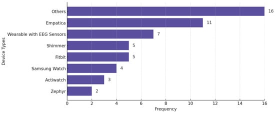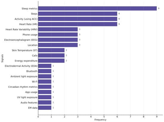 Figure 4 illustrates the distribution of biosignals used in the stress monitoring studies we reviewed, highlighting the predominance of GSR/EDA, raw PPG, ST, HR, ACC, and HRV as common physiological signals used in stress monitoring/detection research.