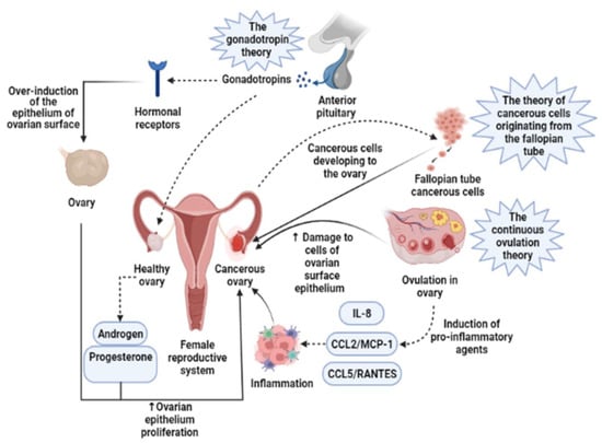 Three main theories regarding the development of ovarian cancer are based on induction of the epithelium of the ovarian surface by hormonal receptors, increased induction of pro-inflammatory agents during continuous ovulation, and cancerous cells originating from the fallopian tube. IL-8, Interleukin-8; CCL2/MCP-1, Monocyte chemoattractant protein-1; CCL5/RANTES, CC Chemokine Ligand-5. The image is adopted from Tazangi et al., 2021, with copyright permission under the terms of the CC BY NC ND 4.0 license [12].