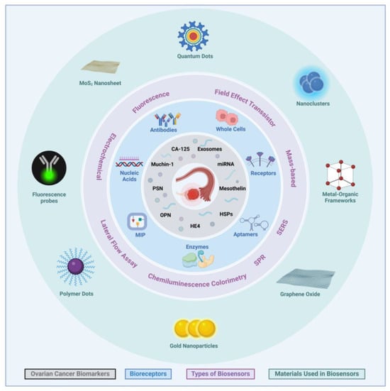 Schematic representation of ovarian cancer biomarkers detection using various recognition elements and sensing materials used for sensor development.