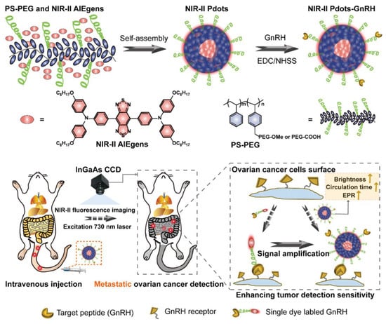 Moreover, for intraoperative diagnosis of ovarian cancer, fluorescence imaging is the preferred choice. Zhou et al. established NIR-II fluorescence imaging with polymer dots (NIR-II Pdots), particularly to target metastasis and enable early diagnosis. To implement this design, the NIR-II Pdots must self-assemble based on hydrophobic interaction with water, where NIR-II aggregation generates emission luminogens (AIEgens) within a polystyrene-graft-polyethylene glycol (PS-PEG) matrix to prolong blood circulation time. The modification of NIR-II Pdots with the insertion of peptides, such as tumor-specific cetrorelix, forms NIR-II Pdots-GnRH, which target gonadotropin-releasing hormone receptors that are overexpressed in ovarian cancer, heightening affinity towards the tumor cells [73]. AIEgens exhibit strong fluorescence, which is further enhanced by mixing tetrahydrofuran (THF) with methanol. Further, NIR-II Pdots have brighter probes compared to other nanoparticles in the aggregate state. To observe the effects of Zhou et al.’s strategy, intravenous injection of the NIR-II Pdots enables the visualization of hematogenous and lymphatic metastasis, enhancing real-time detection in NIR-II fluorescence imaging (Figure 3).