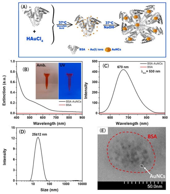 (A) Schematic representation of the two-step synthesis of photoluminescent BSA-AuNCs. (B) The absorption spectra (the inset—BSA-AuNCs under ambient (amb.) and UV illumination); (C) the hydrodynamic size of BSA (red line) and BSA-AuNCs (black line); (D) the photoluminescence; and (E) the HRTEM image of BSA-AuNCs. The image is adapted from Hada et al., 2021, with copyright permission [74].