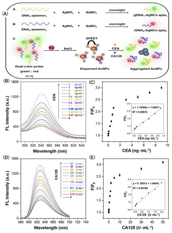 (A) Schematic illustration of the interaction between DNA-AgNCs-aptas and AuNPs in the absence and in the presence of CEA and CA-125, and the corresponding fluorescence responses. (B,D) Evolution of fluorescence spectra of gDNA1-AgNCs-apta1 and rDNA2-AgNCs-apta2 (in the presence of AuNPs and NaCl) with the increase in target amount, respectively. (C,E) The linear relationships between F/F0 and the concentrations of CEA and CA-125, respectively. F/F0 represents the fluorescence intensity in the presence and absence of targets. The image is adapted from Xu et al., 2020, with copyright permission [83].