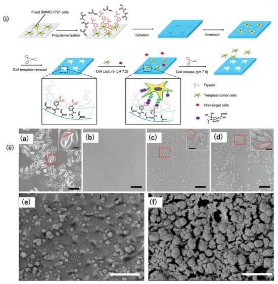 (i) Fabrication of the hydrogel with the synergistic effect of cell imprinting and boronate affinity (PBA-CIH) for the capture and release of SMMC-7721 cells. (ii) Microscopy images of the SMMC-7721 cells on (a) culture dishes and showing the surface morphology (b) NIH, (c) UCIH, and (d) CIH after removing the cell templates. The insets are zoomed in on the imprinted sites in the microscopy image. Cryo-SEM of the nanostructures inside the microstructures of (e) the UCIH and (f) the CIH. Scale bars (a,d) (a–d 100 µm) (e) represent 340 nm, and scale bar (f) represents 500 nm. The image is adapted from Liu et al., 2020, with copyright permission [147].