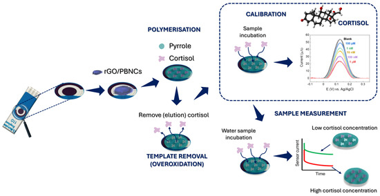 After electropolymerization, the electrodes were rinsed with PBS, and pyrrole overoxidation was performed to remove the cortisol from the polymer matrix (Figure 1). This process was carried out using CV at a potential window of −1.0 to +1.0 V in 10 mM PBS for 10 cycles at a scan rate of 50 mV s−1. The electrodes were then thoroughly rinsed with PBS and air-dried at room temperature. As a control, films of non-imprinting polymers (NIPs) were prepared under the same conditions, but without the addition of cortisol.