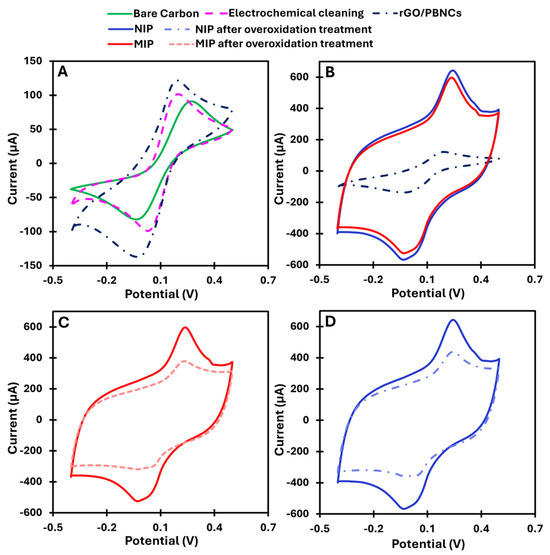 CV measurements were performed at various stages of the fabrication process for the MIP and NIP. (A,B) The CV response following the immobilization of the rGO/PBNC nanocomposites and subsequent formation of the MIP and its non-imprinted control. (C) The CV response of the MIP after the removal of the target molecule, and (D) the corresponding response for the NIP.