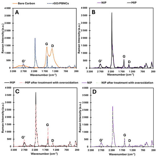 Raman spectroscopy for (A) SPCE and SPCE/rGO/PBNCs, (B) SPCE/rGO/PBNCs/MIP, SPCE/rGO/PBNCs/NIP, (C) SPCE/rGO/PBNCs/MIP and SPCE/rGO/PBNC/MIP after treatment with overoxidation, and (D) SPCE/rGO/PBNC/NIP and SPCE/rGO/PBNC/NIP after treatment with overoxidation.