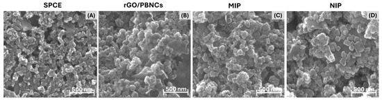 Morphological analysis of the SPCEs, rGO/PBNCs, and MIP and NIP materials was performed using SEM, and the results are shown in Figure 4. The SEM images clearly show the formation of nanocubes with an average length between 30 and 100 nm. Furthermore, the presence of graphene sheets within the nanocomposite material can be observed, indicating the successful integration of graphene oxide (GO) into the nanocomposite structure.
