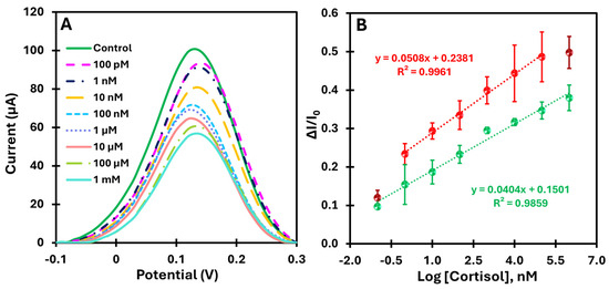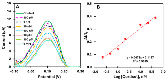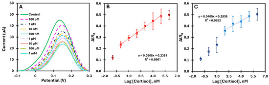 For the direct measurement of cortisol using the catalytic properties of the rGO/PBNCs compound, the biomimetic sensor was evaluated by directly analyzing cortisol prepared in buffer. This approach was used to demonstrate the feasibility of real-time monitoring of cortisol without external redox probes. The calibration of the sensor was performed with cortisol solutions in a wide concentration range from 100 pM to 1 mM. This allowed the evaluation of the sensitivity and dynamic response of the sensor under conditions relevant to practical applications. Figure 7A shows the SWV voltammograms for the different cortisol concentrations tested. A consistent decrease in peak current was observed with increasing cortisol concentration, confirming the sensor’s ability to detect cortisol directly and continuously. Figure 7B shows the corresponding calibration curve plotting the relative change in current (ΔI/I0) against the logarithm of cortisol concentration. The sensor showed a linear response in the range of 100 pM to 1 mM, with a slope of 0.0473 log[cortisol] and a lower limit of detection of 23.0 pM.