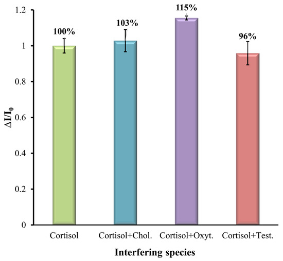 Considering that the electrochemical signal of the 1 mM cortisol solution accounts for 100% of the reaction, the interference effect was calculated using Equation (1):