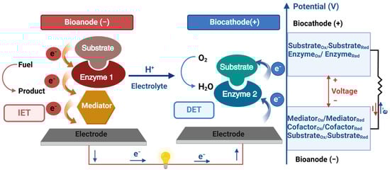 Schematic representation of an EBFC, demonstrating mediator-assisted electron transfer at the bioanode (−) and direct electron transfer at the biocathode (+). The diagram also highlights proton (H+) movement across the electrolyte and the generation of voltage within the system.