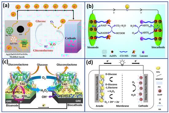 Their natural talent for promoting catalytic reactions while maintaining stability is crucial in energy conversion. The importance of noble metals in EBFCs is highlighted by their ability to catalyze electrooxidation and electroreduction reactions that are fundamental to bioelectrocatalysis [112,113]. By providing active sites for these reactions, noble metals accelerate the rate of reactions, resulting in improved overall efficiency. Additionally, their inherent compatibility with biological systems ensures seamless integration, guaranteeing the stability and durability of EBFC devices in living environments. In a recent study, Ahamed et al. [114] presented a novel method for synthesizing a composite scaffold material. This material combines silver nanoparticles (AgNPs) with zinc oxide (ZnO) and is specifically designed for use in EBFCs, as depicted in Figure 4a. The proposed approach ensures the production of environmentally friendly materials and enhances their catalytic activity and stability. The composite material, Ag@ZnO-NP/GO, effectively facilitates electron transfer during bioelectrocatalysis. It achieved impressive current densities of 7.7 mA cm−2 at a glucose concentration of 30 mM. Another significant study by Gai et al. [115] introduced a nitrogen-doped graphene/gold nanoparticles/formate dehydrogenase (NG/AuNPs/FDH) bioanode (Figure 4b). This bioanode demonstrated efficient recycling of NAD+/NADH (nicotinamide adenine dinucleotide with hydrogen) during formic acid oxidation, resulting in a remarkable reduction in NADH oxidation overpotential. This advancement paved the way for the development of a membrane-less formic acid/O2 enzymatic biofuel cell that exhibits exceptional performance metrics. These included a maximum power density of 1.96 mW cm−2 and an open circuit potential of 0.95 V, with 80% maintenance over a 20-day period. Moreover, when two units were connected in series, the EBFC successfully powered red LEDs, demonstrating its practical applicability.