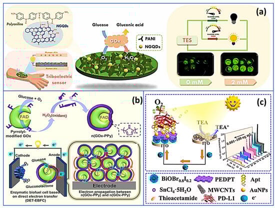 Applications of CPs in enzymatic biofuel cell: (a) Polyaniline as a flexible substrate for immobilization. Reproduced with permission from [121], (b) In situ growth of PPy for GOx encapsulation. Reproduced with permission from [122], (c) PEDOT integration in hybrid material for self-powered photoelectrochemical/visual sensing. Reproduced with permission from [123].