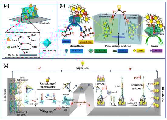 Applications of MOFs in enzymatic biofuel cell: (a) MIL-100(FeMOF) as immobilization matrix of laccase. Reproduced with permission from [135], (b) ZIF-8 as a host matrix for GOx. Reproduced with permission from [136], (c) ZIF-L as encapsulation matrix for GDH. Reproduced with permission from [137].
