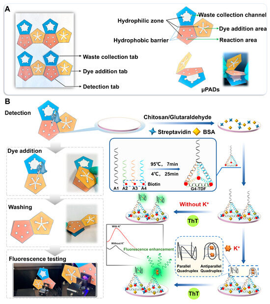 The following supporting information can be downloaded at https://www.mdpi.com/article/10.3390/bios15040223/s1, Figure S1: Agarose gel electrophoretic characterization of G4-TDF. Lane 1, A1; lane 2, A2; lane 3, A1+A2; lane 4, A1+A2+A3; and lane 5, G4-TDF (A1+A2+A3+A4); Figure S2: (A) The appearance of the dye addition tab (tab II) under daylight when the fluorescence dye ThT was added. Upon the introduction of the fluorescent dye thioflavin T (ThT) at the central site of tab II, the ThT-containing solution underwent a rapid propagation along the well-defined hydrophilic channels, driven by capillary forces. (B) The images of the five reaction zones within detection the tab under UV light at different times after the fluorescence dye ThT was added; Figure S3: Circular dichroism spectra of G4-TDF/ThT. The positive peak at about 274 nm and the negative peak at about 248 nm indicating the formation of G4 structure; Figure S4: Reproducibility of the proposed fluorescence μPADs sensing platform (ΔF = F − F0, where F and F0 represent the fluorescence intensity changed values in the presence and absence of K+); Table S1: Recovery results of this assay for K+ detection in human serum sample; Table S2: Sequences of oligonucleotides used in this work.