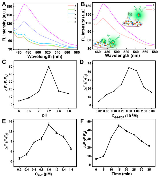 (A) Fluorescence spectra of the designed origami μPADs under different conditions: (a) μPADs; (b) μPADs + G4-TDF; (c) μPADs + G4-TDF + K+; (d) μPADs + G4-TDF + ThT; and (e) μPADs + G4-TDF + K++ ThT. (B) Fluorescence spectra of the designed origami μPADs under different systems: (a) μPADs + G4-TDF + K++ ThT, and (b) μPADs + C-DNA + K++ ThT. (C–F) Optimization of experimental parameters. Effects of the pH of the buffer (C), the concentration of G4-TDF (D), the concentration of ThT (E), and reaction time (F) on K+ fluorescence sensing origami μPADs. (The concentration of K+ was 5 mM).