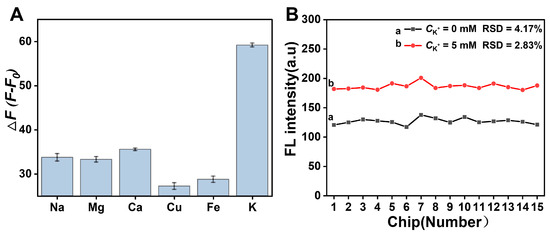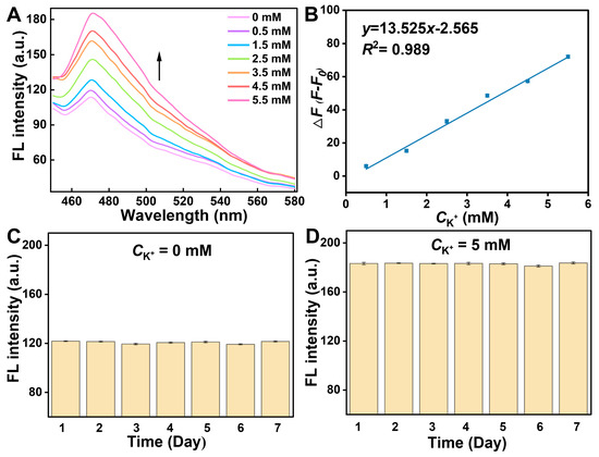 Potassium ion (K+), as one of the indispensable species in the human body, plays a vital role in regulating numerous physiological processes, including nerve transmission, regulation of pH and blood pressure, enzyme activation, and maintenance of muscle strength [1,2,3]. The normal level of human serum K+ is around 3.5–5.0 mM [4]. Abnormal potassium ion concentrations may cause a variety of diseases, such as heart disease, high blood pressure, diabetes, kidney disease, stroke, and Addison’s disease [5,6]. Therefore, rapid and convenient sensitive detection of K+ is of significant importance. Toward this goal, many analytical methods have been established for the determination of K+, including inductively coupled plasma–mass spectrometry [7,8], atomic absorption spectroscopy [9,10], flame atomic absorption spectrometry [11,12], surface plasmon resonance [13,14], and ion chromatography [15,16]. Although these techniques are effective in detecting potassium ions, there are still obstacles that need to be overcome, such as their complex operation, time-consuming nature, and use of expensive instruments. Thus, it is necessary and meaningful to develop a simple and rapid method for the determination of K+.
