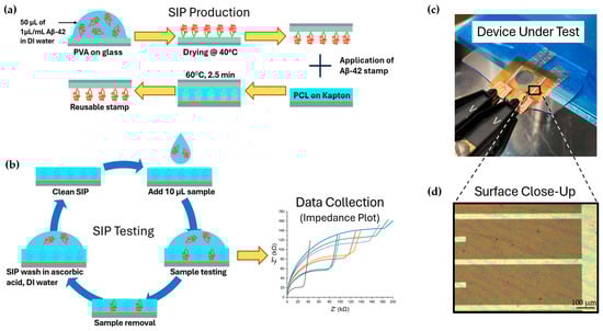 Comparison of PVA (a) with and (b) without the Aβ-42 stamp. SEM images comparing (c) a NIP surface and (d) a SIP PCL surface over similar IDE structures.