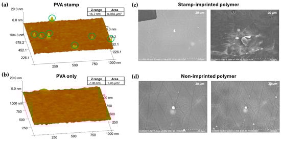 Figure 2 highlights the surface roughness of the PVA stamps with and without Aβ-42 imprinting, revealing distinct surface properties between the imprinted and non-imprinted regions, which can be observed in the contrast between Figure 2a,b, where the spikes (circled in green) and the increase in the Z-range (from 7.96 nm to 16.7 nm) indicate the presence of mostly Aβ-42 monomers and lower-order oligomers, along with some Aβ-42 protein aggregates on the PVA stamp surface. Figure 2c,d show the success of the imprinting process through scanning electron microscopy (SEM) images of SIP (c) and NIP (d) surfaces. Due to the presence of proteins, SIPs are typically characterized by a higher crystal density of PCL, as Aβ-42 acts as a nucleation site for crystallization when it cools [].