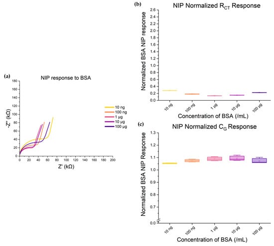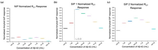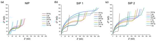 Charge transfer resistance (RCT) responses of (a) NIP, (b) SIP 1, and (c) SIP 2, expressed as a ratio to the devices’ baseline response to DI water. While all devices responded to the change in concentration of the analyte, SIP 1 and SIP 2 showed a much larger change in RCT as a result of concentration than the NIP, with the extracted limit of detection of SIP 1 being 6.0 pg/mL.