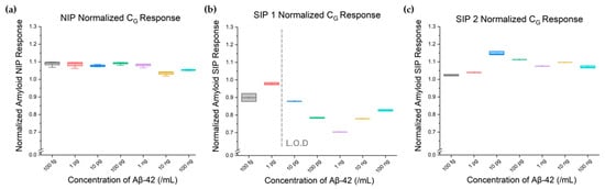 Table 2 reports the raw geometric capacitance, CG, the parameter extracted for DI, and the different analyte concentrations for each device. Hypothesis testing of the means with a one-way ANOVA followed by Tukey’s test reveals a significant difference between SIPs and the NIP at DI (SIP 1 > NIP at p = 0.02138; SIP 2 > NIP at p = 0.00599) and 100 fg/mL of Aβ-42 (SIP 1 < NIP at p = 0.00005; SIP 2 < NIP at p = 0.00158). Whether the sensor is imprinted or not is not the cause of significant CG differences at higher concentrations.