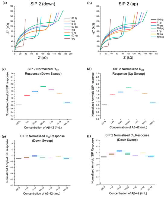 Two distinct trials involving SIP 2 were employed to detect varying concentrations of Aβ-42. The goal of this trial was threefold: (1) to determine if multiple SIPs produced with the same stamp would display a similar response curve (explored in Section 3.1, Section 3.2 and Section 3.3); (2) to see if the SIP-EIS device was reusable over more than one trial, and (3) to determine if the direction of the concentration change affected device response. The first trial (Figure 6a,c,e) was a downsweep, performed starting with the highest (1 µg/mL) concentration of Aβ-42, whereas the second trial (Figure 6b,d,f) was an upsweep, performed starting at the lowest concentration (100 fg/mL). As established in Section 3.2 and Section 3.3 (Table 1 and Table 2), the RCT and CG responses from 10 pg/mL and upwards remain mostly consistent between SIP 1 and SIP 2, an early indicator of inter-device reliability using the same stamp. Furthermore, between the downsweep and the upsweep trials, SIP 2’s concentration response remains essentially the same. Combined with previous observations from the NIP, this confirms that the limited interactions between Aβ-42 and PCL do not lead to Aβ-42 build-up on PCL that could have otherwise affected SIP 2’s sensitivity to different concentrations within the two trials.