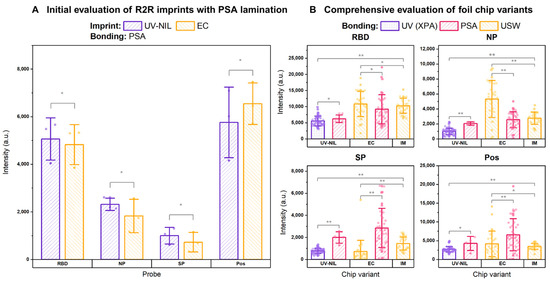 (A) Preliminary feasibility testing of UV-NIL and EC imprints as suitable candidates for assay implementation. To enable rapid lamination, we used hydrophilic PSA as a bonding layer to form the cover foil for both types of imprints (N = 3 for each variant), which initially showed comparable chemiluminescence across all probes. (B) Comprehensive evaluations of foil chip performance and the effect of lamination strategies with respect to GENSPEED’s IM standard chips (N = 25). In the UV-NIL group, PSA-bonded chips (N = 4) exhibited higher signals compared to UV-laminated variants (N = 51), possibly due to UV-induced damages (UV-dose: 14 W/cm2). In the EC group, ultrasonically welded (USW) chips (N = 28) showed higher signals in RBD and NP than PSA-laminated variants (N = 33), suggesting the effect of a slower flow rate that permitted a better mass transport to the sensor’s surface. (* denotes p > 0.05, ** denotes p < 0.05).