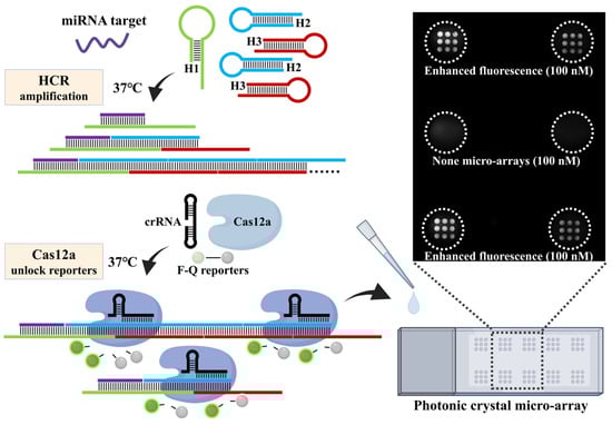 Schematic illustration of miRNA detection by CRISPR/Cas12a and enhanced fluorescence by photonic crystal microarrays.