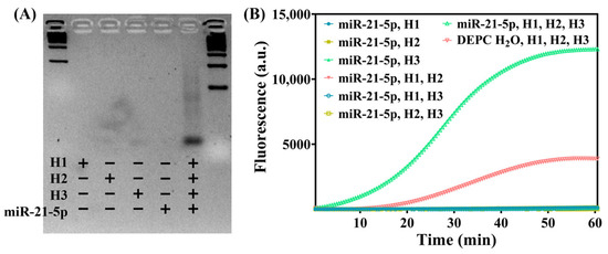 First, 2% agarose gel electrophoresis was used to validate the effective initiation of HCR by miR-21-5p (Figure 2A). To ensure that RNA degradation during the electrophoresis process did not affect the detection results, a DNA mimic of miR-21-5p was used, in which uracil (U) in the sequence was replaced with thymine (T). The different lanes of the gel were loaded with mixtures containing different components, and the gel was incubated at 37 °C for 30 min. The concentration of both the DNA hairpins and the miR-21-5p DNA analog was 1 μM. The gel imaging results demonstrated that the HCR occurred only when both the miR-21-5p DNA analog, as the detection target and HCR initiator, and the three types of DNA hairpins were present in the system. This was indicated by distinct trailing bands in corresponding lanes, suggesting the presence of multiple DNA chains with varying lengths. These products aligned with HCR reactions in which multiple initiations may occur simultaneously but progress at different rates. In other lanes, in which the components were not present in sufficient quantities, no detectable chain extension occurred, and only free short hairpins (48 nt in length with a stem up to 18 nt) were present, without any obvious bands.