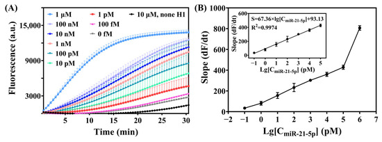 To test the sensitivity of this detection strategy, we compared the real-time fluorescence curves of miR-21-5p at different concentrations under optimal experimental conditions. The real-time fluorescence curves (Figure 3A) showed that miR-21-5p at 1 pM could be clearly distinguished from the blank control group after 20 min of reaction. The fluorescence intensity linearly increased for 15 min. The relationship between the slope of the fluorescence intensity and the logarithm of miR-21-5p concentration (lg[CmiR-21-5p] (pM)) was examined (Figure 3B); the slope linearly increased with the logarithm of miR-21-5p concentration over a wide range, from 1 pM to 100 nM. The linear regression equation was S = 67.36 × lg[CmiR-21-5p] + 93.13 (R2 = 0.9974), with a limit of detection of 1 pM (final concentration), and the dynamic detection range of CRISPR-HCR was from 1 pM to 1 μM.