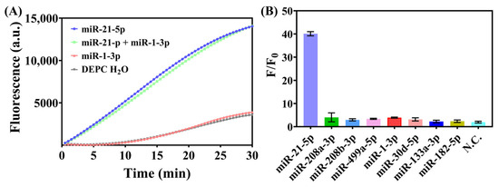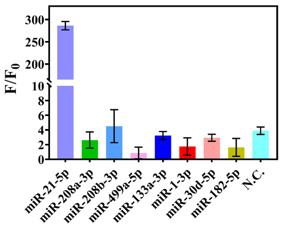 To examine the specificity of this one-pot strategy for target miRNA detection, we measured the fluorescence signal response to the target miR-21-5p and non-target RNAs (miR-208a-3p, miR-208b-3p, miR-499a-5p, miR-133-3p, miR-1-3p, miR-182-5p, miR-30d-5p, and a random sequence single strand N.C.) under the same conditions. Only when the target miR-21-5p was present did a strong fluorescence signal appear, whereas the fluorescence signals of the non-target miRNAs were very weak. The fluorescence signals of the target miRNA-21-5p and non-target RNAs differed greatly (Figure S4). Since the concentration of each component was higher than it was in the original two-step method, the F/F0 of the target increased (Figure 7).