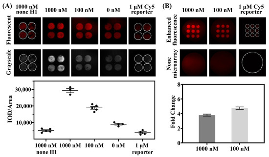 By utilizing inkjet-printed photonic crystal microarrays, specific fluorescence can be selectively enhanced [18,28,29]. The prepared photonic crystal microarray for detection, as shown in Figure S2A, was matched with its stopband by replacing the previously used FAM F-Q reporter with a Cy5 F-Q reporter. After incubating the prepared CRISPR-HCR system at a constant temperature of 37 °C for 10 min, the system was dropped onto the photonic dot array and placed on a metal bath heating platform for further incubation. Once the liquid components were almost completely dry, a LuxScan scanner was used to capture fluorescence images (Figure 5). Statistical analysis of grayscale values showed that the photonic crystal microarray moderately enhanced the fluorescence intensity, which remained correlated with the target miRNA concentration (Figure 5A), and the best fold change in the fluorescent intensity was calculated to be 4.9 (when the concentration of miR-21-5p was 100 nM).