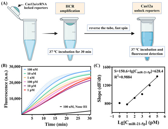 The CRISPR/Cas system with collateral activity can be utilized for sensitive and efficient nucleic acid detection and has clinical translational potential. Researchers have realized the detection of a variety of viruses [6,7,8,9,10,11], and the system is being further developed for the detection of miRNA disease markers [12,13]. The signal transformation and amplification of target miRNAs by CRISPR/Cas combined with enzyme-free isothermal hybridization chain reaction (HCR) have been reported to achieve accurate and convenient detection of miRNAs [14,15].