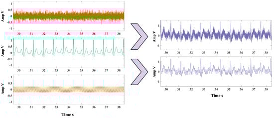As shown in Figure 6, the interference signals consisted of PLI signals with varying amplitudes and BWN signals. The frequency of the PLI signal was set to 12 Hz, overlapping with the heartbeat signal’s frequency band. The initial SNR was set to 0 dB, 3 dB, 5 dB, and 7 dB, based on the ratio of the power of the simulated heartbeat signal to the interference signals.