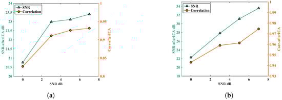 Figure 9a shows that, when the input signal was the simulated heartbeat signal with added PLI noise, as the input SNR increased (i.e., the power of the added interference signal decreased), the SNR of the output multi-channel signal improved. At an input SNR of 7 dB, the output SNR reached up to 23.5 dB. The SNR improvement ratio () decreased gradually, indicating that the proposed method performed better in suppressing noise when the input signal had higher noise levels.